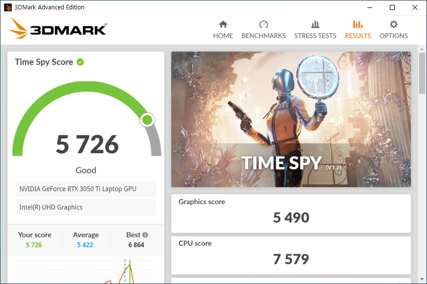 3DMARK를 이용해서 엔비디아 GeForce RTX3050 Ti 그래픽카드의 성능을 살펴보면 Fire Strike는 12,844점(Graphics Score 14,134점), Time Spy는 5,726점(Graphics Score 5,490점)으로 측정되었습니다.