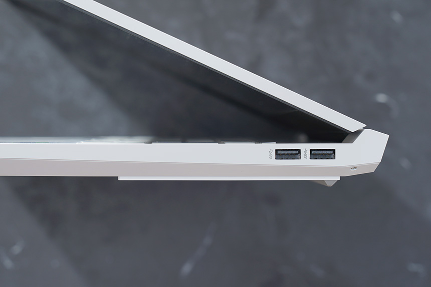 반대쪽 옆면에는 2개의 USB 타입A 포트가 탑재되었습니다. 확장성이 우수한 편이어서 외장 모니터나 각종 컴퓨터 주변 기기들을 연결해서 사용할 수 있습니다. 콘텐츠 크리에이터들에게도 유용한 특징 중의 하나입니다.
