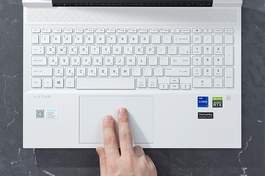 HP 빅터스 16-d0186TX의 터치패드는 큼지막한 편이고 멀티 터치 제스처를 지원해서 여러 손가락을 이용해서 웹 페이지나 문서를 스크롤하거나 실행하고 있는 프로그램을 전환할 수 있습니다.
