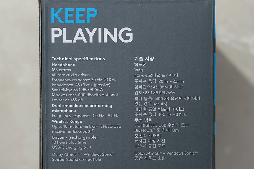 박스의 옆쪽에는 로지텍 G435 게이밍 헤드셋의 스펙이 설명되어 있습니다. 주목할 만한 부분은 무게가 165g으로 가볍다는 점과 내장형 듀얼 빔포밍 마이크를 탑재하고 있다는 점입니다.