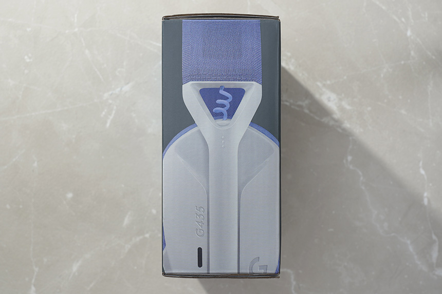 반대쪽 옆면에는 로지텍 G435 게이밍 헤드셋의 디자인이 인쇄되어 있습니다. 잠시 후에 확인해보겠지만 일반적인 게임용 헤드셋과는 다르게 캐주얼하게 제작되어서 야외에서도 부담 없이 사용할 수 있습니다.