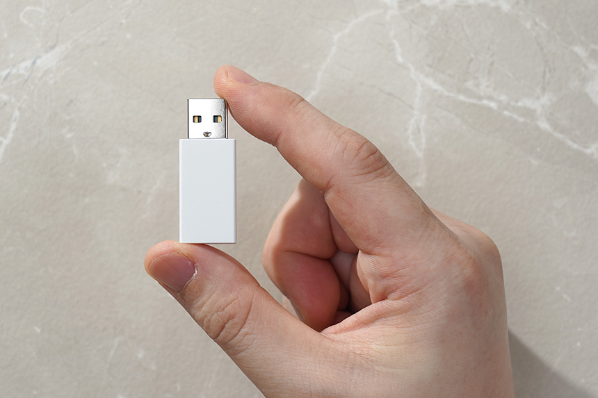 로지텍 G435 게이밍 헤드셋의 구성품에는 LIGHTSPEED 무선 USB-A 수신기가 하나 포함되어 있습니다. 크기가 콤팩트한 편이어서 데스크톱이나 게이밍 노트북에 연결해서 사용해도 크게 불편하지 않을 것으로 예상합니다.