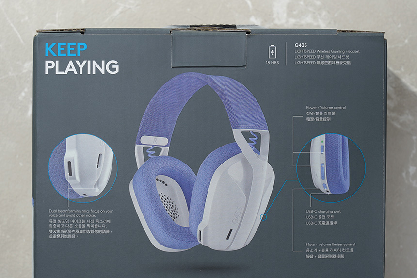 박스의 뒷면에는 로지텍 G435 게이밍 헤드셋의 구조가 설명되어 있습니다. 우선 주목해 보아야 할 부분은 한 번의 충전으로 최대 18시간 정도를 사용할 수 있다는 점입니다. 일상용으로 사용하기에 부족하지 않을 것 같습니다.