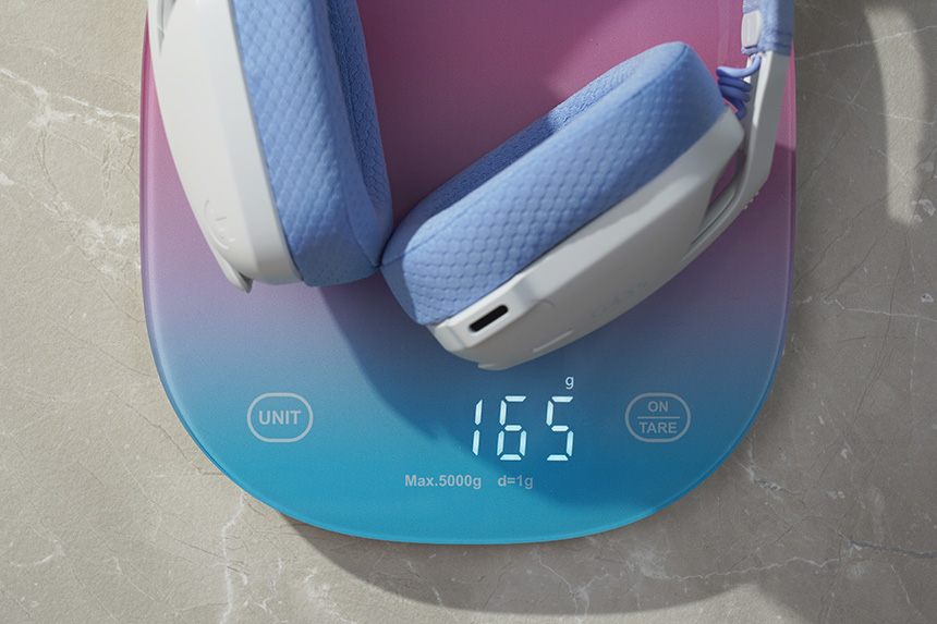 로지텍 G435 게이밍 헤드셋의 무게는 165g으로 측정되었습니다. 무선으로 설계되어서 배터리가 내장되어 있음에도 불구하고 가벼운 축에 속합니다. 그래서 장시간 착용해도 크게 부담스럽지 않습니다.