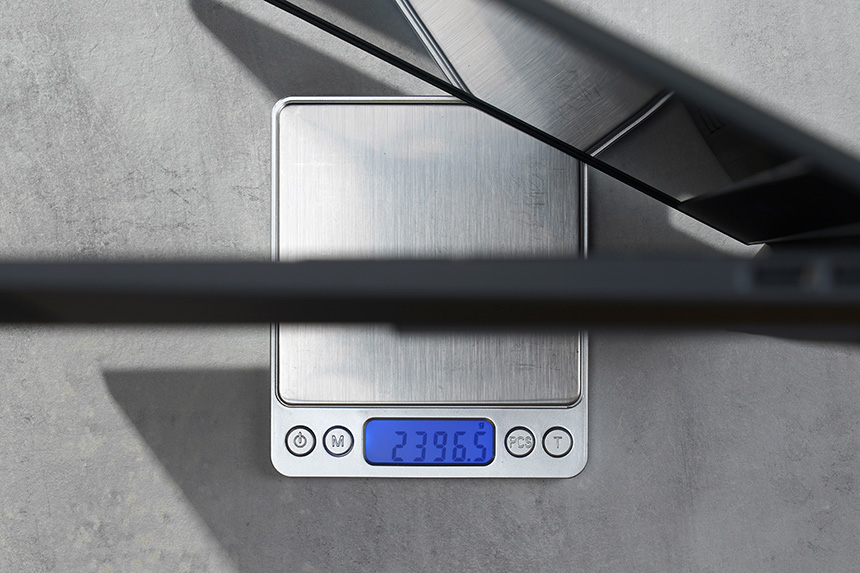 무게는 약 2.39kg으로 측정되었습니다. 추가 메모리나 저장 장치의 장착 여부에 따라서 약간의 차이가 발생할 수 있습니다. 역시 다른 게이밍 노트북과 비교해서 무난한 편이라고 할 수 있습니다.