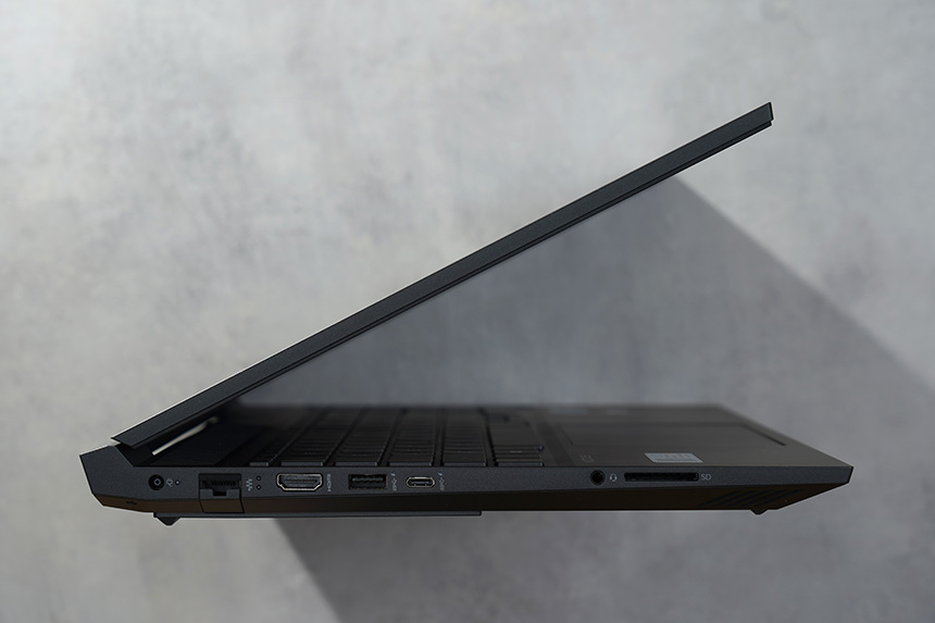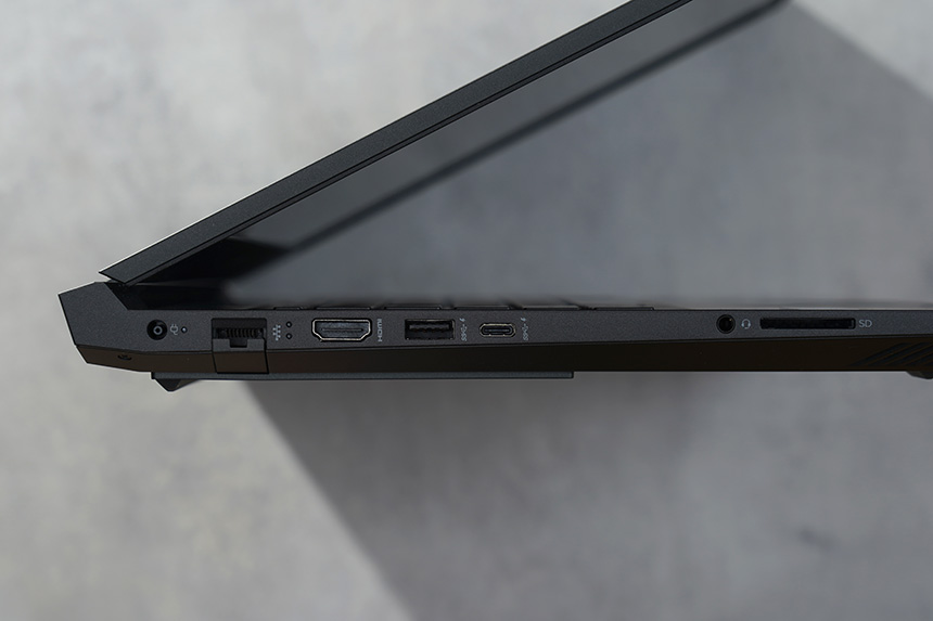 HP 빅터스 16-d0181TX의 입출력 단자를 살펴보면 왼쪽에는 전원과 유선 랜 그리고 HDMI, USB 타입A와 C 포트, 오디오 콤보, SD카드 리더가 준비되어 있습니다. 메모리 카드 리더를 탑재하고 있어서 콘텐츠 크리에이터가 사용해도 좋을 것 같습니다.