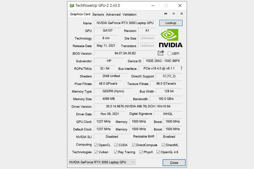 HP 빅터스 16-d0181TX에는 엔비디아 GeForce RTX3050 그래픽카드가 탑재되었습니다. 엔트리급 제품이기는 하지만 국내에서 인기 있는 게임들은 대부분 플레이할 수 있습니다.