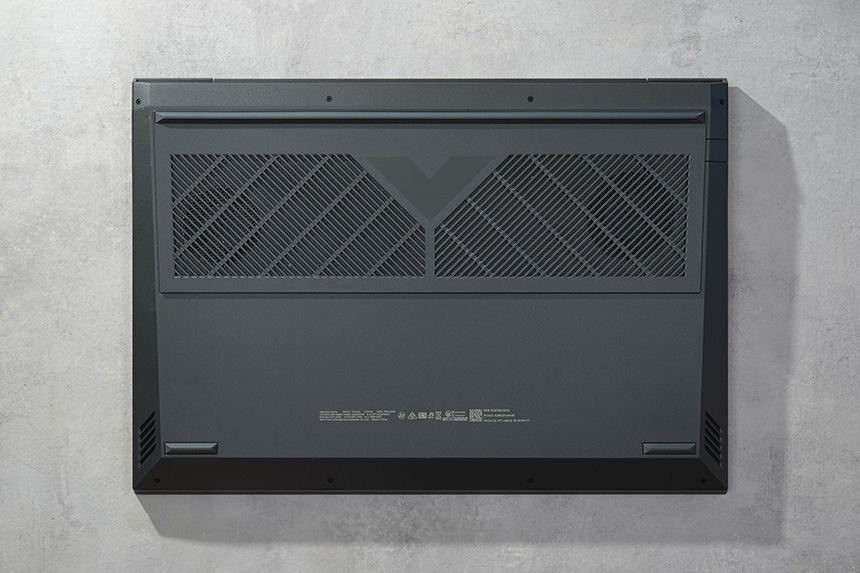 바닥을 살펴보면 위아래에 고무 지지대가 배치되어 있어서 책상 위에서 잘 미끄러지지 않습니다. 그리고 HP 빅터스 16-d0181TX에는 2중 팬 설계와 4개의 히트 파이프로 구성된 OMEN Tempest 냉각 기술이 적용되었는데요. 게임을 플레이할 때의 온도는 잠시 후에 확인해 보도록 하겠습니다.
