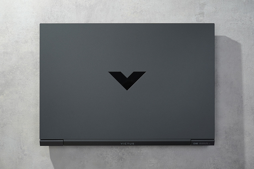 HP 빅터스 16-d0181TX의 색상은 마이카 실버(Mica Silver)로 제작되었는데요. 세련된 느낌을 주는 편입니다. 그리고 중앙에는 디자인에 포인트가 되는 V자 형태의 로고가 배치되어 있습니다.