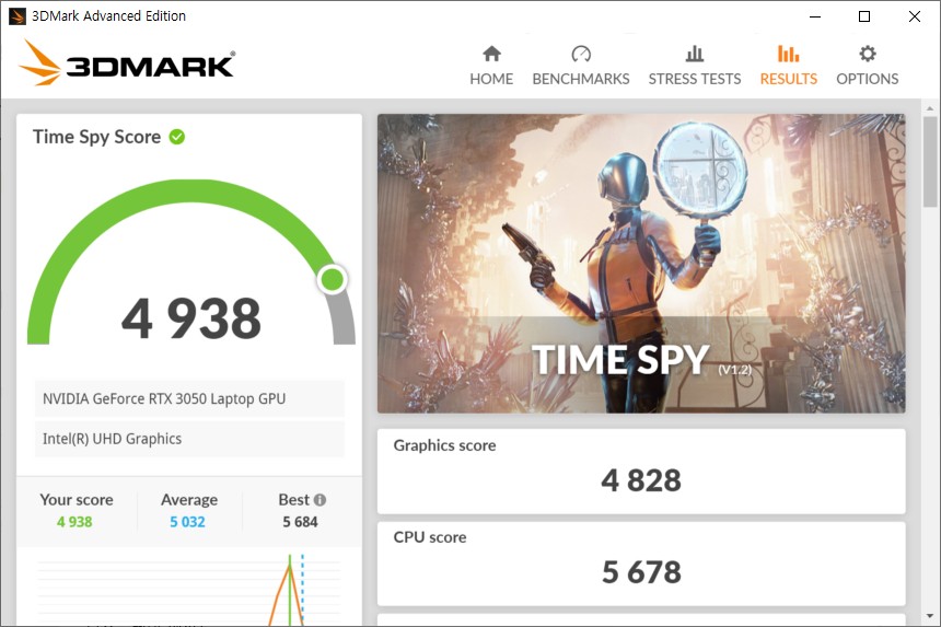 3DMARK를 통해서 엔비디아 GeForce RTX3050 그래픽카드의 성능을 살펴보면 파이어 스트라이크(Fire Strike)는 11,420점(그래픽 스코어 12,787점), 타임 스파이(Time Spy)는 4,938점(4,828점)으로 측정되었습니다.
