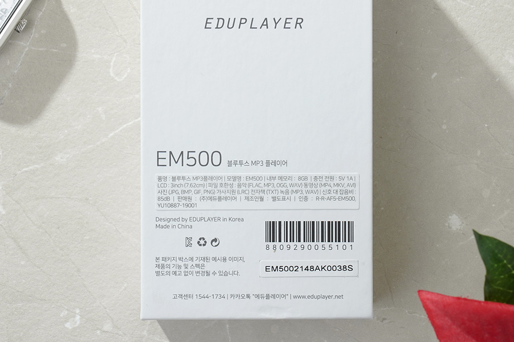 박스의 뒷면을 살펴보면 에듀플레이어 EM500의 스펙이 표시되어 있습니다. 내장 메모리는 8GB이고 3인치 크기의 터치 디스플레이를 탑재했습니다. 그 외에도 FLAC, MP3, OGG, MP4, MKV와 같은 포맷의 음악과 동영상을 재생할 수 있습니다.