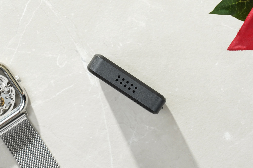 옆쪽을 살펴보면 볼륨과 전원 버튼이 배치되어 있습니다. 그리고 아래쪽에 마이크가 내장되어 있어서 (녹음기)보이스 레코더로도 활용할 수 있습니다. 녹음 품질은 동영상 리뷰에서 확인하실 수 있습니다.