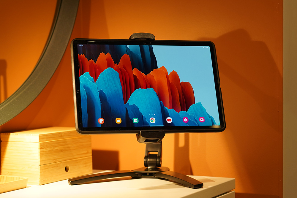 지니비 2단 거치대 GTS2에 제가 사용하고 있는 삼성 갤럭시탭 S7+를 장착해 보았는데요. 안정적으로 거치할 수 있었지만 앞으로 많이 당기면 쏠리는 현상이 발생했습니다. 적절하게 각도 조절이 필요해 보입니다.