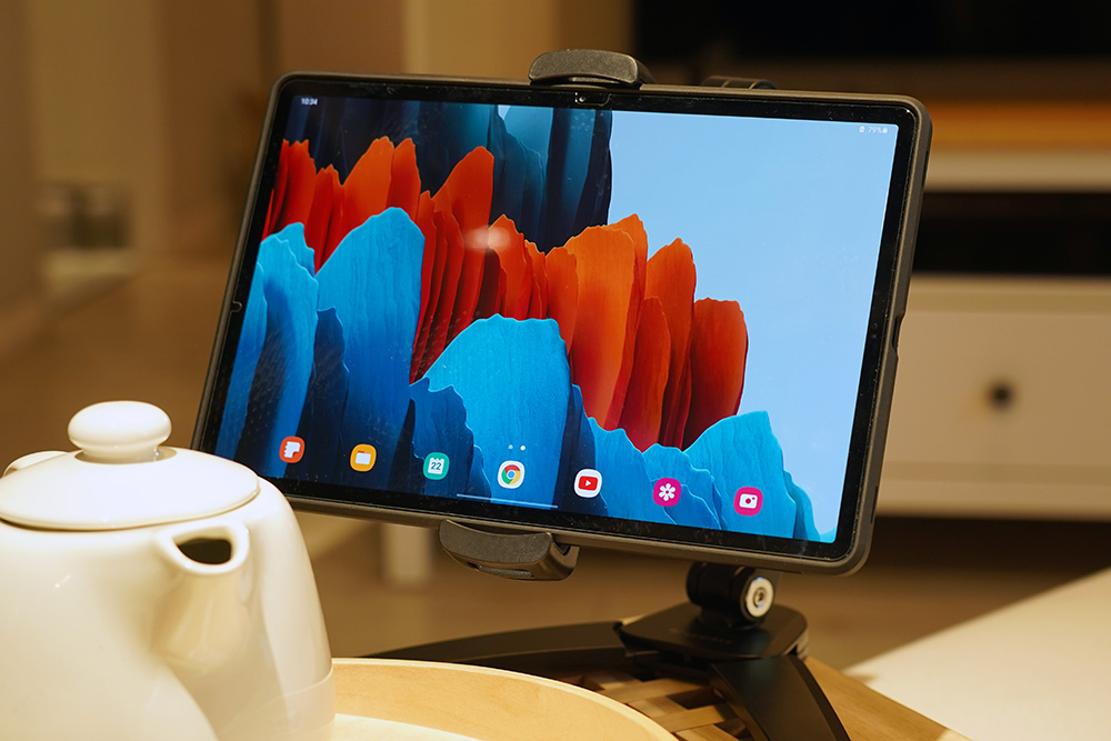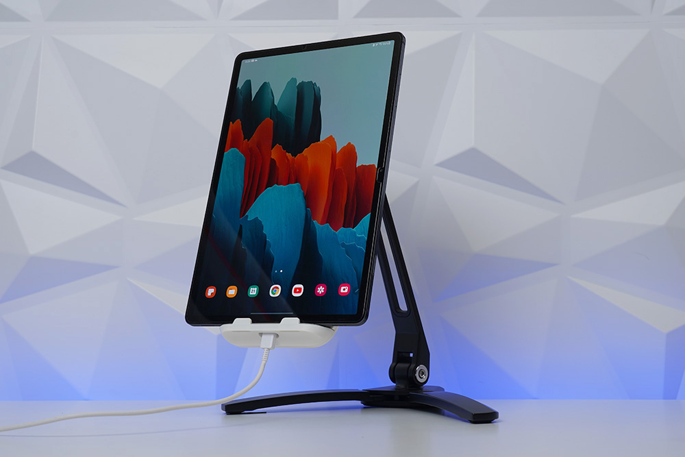 지니비 2단 거치대 GTS2에 패드형 H1 헤드를 장착하면 제가 사용하고 있는 삼성 갤럭시탭 S7+를 가로나 세로 형태로 안정적으로 거치할 수 있었고 충전도 편리했습니다.