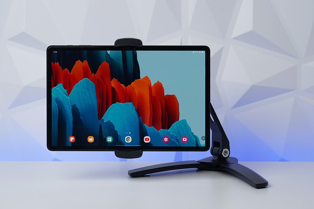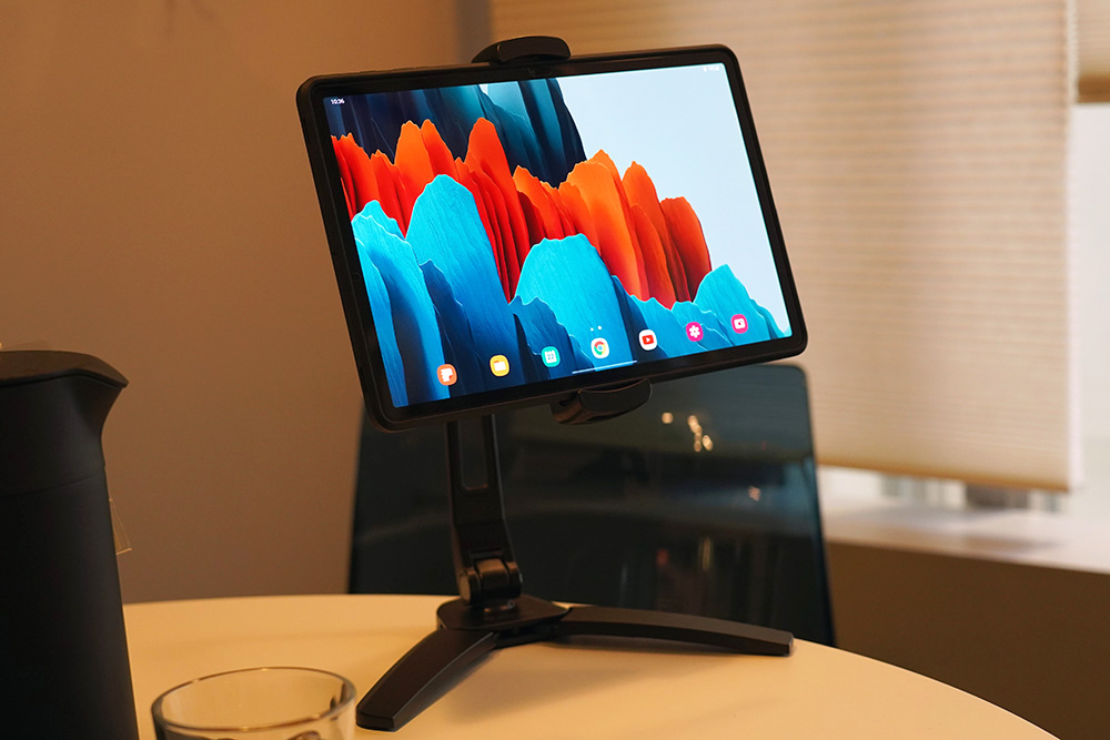 지니비 2단 거치대 GTS2에 제가 사용하고 있는 삼성 갤럭시탭 S7+를 장착해 보았는데요. 안정적으로 거치할 수 있었지만 앞으로 많이 당기면 쏠리는 현상이 발생했습니다. 적절하게 각도 조절이 필요해 보입니다.