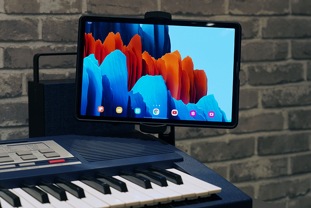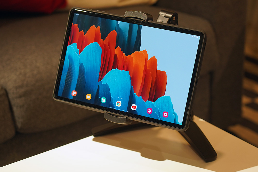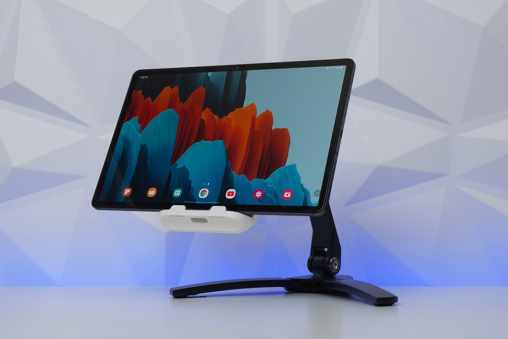 지니비 2단 거치대 GTS2에 패드형 H1 헤드를 장착하면 제가 사용하고 있는 삼성 갤럭시탭 S7+를 가로나 세로 형태로 안정적으로 거치할 수 있었고 충전도 편리했습니다.
