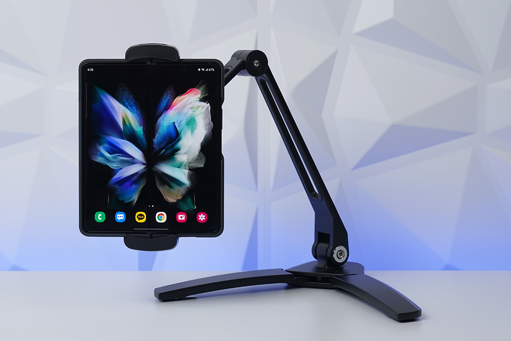 삼성 갤럭시 폴드3의 경우에는 독특한 구조 때문에 함께 사용할 거치대가 적은 편입니다. 그런데 지니비 2단 거치대 GTS2의 기본 클립형 헤드는 위아래를 고정해주기 때문에 편리하게 사용할 수 있었습니다.