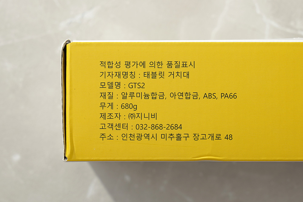 박스의 옆쪽에는 지니비 2단 거치대 GTS2의 스펙이 표시되어 있습니다. 재질은 알루미늄합금과 아연 합금 그리고 ABS 등이 사용되었고 무게는 약 680g입니다.