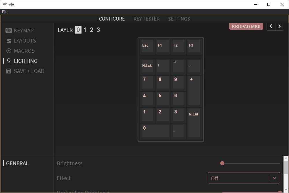 일부 커스텀 키보드의 PCB들은 백라이트를 지원하는 경우가 있습니다. VIA에서는 이러한 조명을 컨트롤하기 위해서 라이팅(LIGHTING) 기능도 준비되어 있습니다. 필요에 따라서 활용해주는 것이 좋을 것 같습니다.