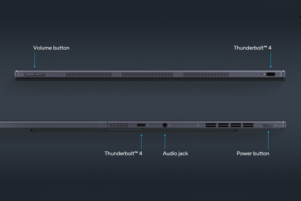 에이수스 Zenbook 17 Fold OLED의 입출력 단자들을 살펴보면 2개의 썬더볼트4와 전원 버튼으로 구성되어 있습니다. 전형적인 윈도우 태블릿의 구성이라고 할 수 있고 확장성이 좋다고 이야기하기는 어려울 것 같습니다.