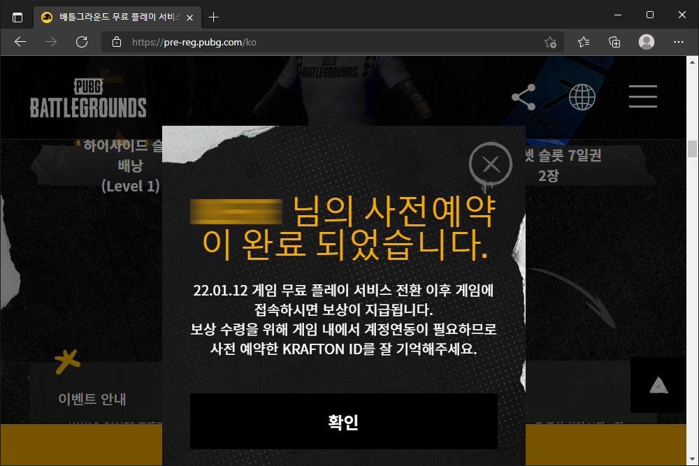 우선 먼저 크래프톤 아이디로 로그인을 해야 합니다. 만약 가입되어 있지 않다면 우선 계정 만들기를 이용해서 생성해 주면 됩니다. 그리고 사전예약 버튼을 누르면 위와 같이 완료가 됩니다.
