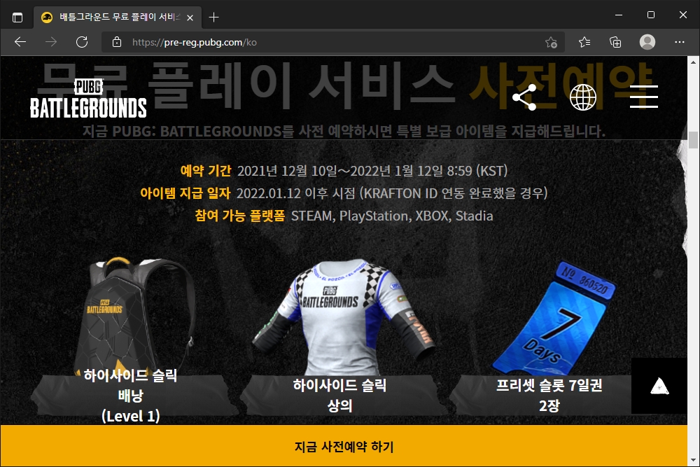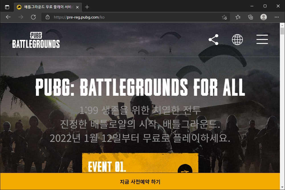사전예약을 하기 위해서는 우선 위쪽에 있는 홈페이지 주소에 접속을 해야 합니다. 그러면 2022년 1월 12일부터 배틀그라운드가 무료로 전환되었다는 내용이 표시되어 있습니다. 참고로 무료 이용자는 경쟁전을 플레이하지 못하거나 하는 등의 약간의 차이가 있습니다.