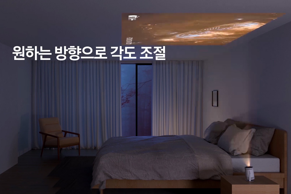 삼성 더 프리스타일은 다양한 방향으로 각도를 조절할 수 있는 기능을 제공합니다. 그래서 앞쪽은 물론이고 천장에서도 간편하게 최대 100인치 화면을 투사할 수 있습니다. 참고로 해상도는 FULL HD(1920x1080)입니다.