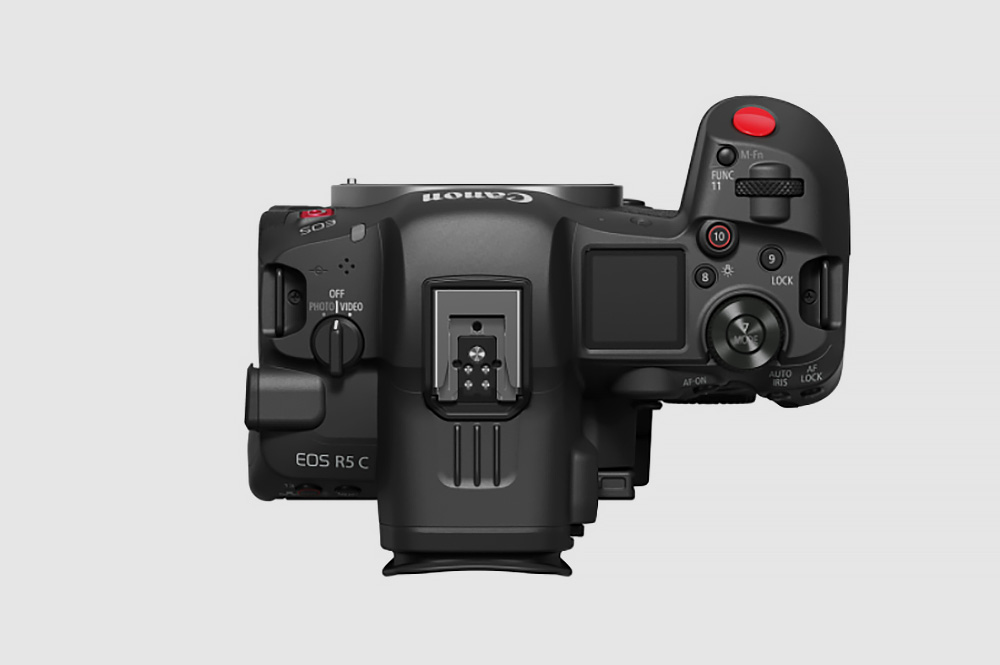 캐논 EOS R5 C 풀프레임 카메라의 상단에는 상태를 표시해주는 LCD 패널과 퀼 컨트롤 다이얼2 그리고 메인 다이얼 등이 배치되어 있습니다. 특히 왼쪽에 배치된 버튼을 이용해서 사진이나 동영상 모드를 빠르게 전환할 수 있습니다. 참고로 PHOTO 모드와 VIDEO 모드 기동 시간은 각각 0.4초와 1.2초입니다.