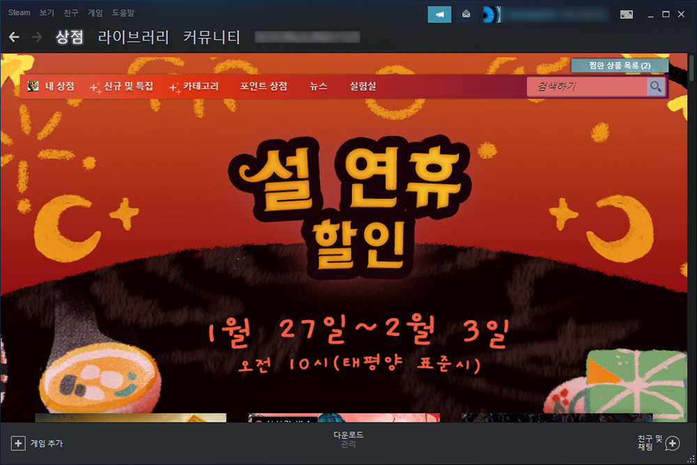 스팀은 세계 최대 규모의 전자 게임 유통 업체입니다. 물론 개발 및 운영 회사인 밸브에서는 하프라이프와 같은 걸출한 게임을 개발하기도 했지만 현재는 유통에 조금 더 방점을 두고 있는 것 같습니다. 그리고 이번에 설 연휴를 맞이해서 다양한 게임들의 할인을 진행하고 있습니다. 그래서 이번 포스티에서 특징을 자세하게 확인해 보도록 하겠습니다.