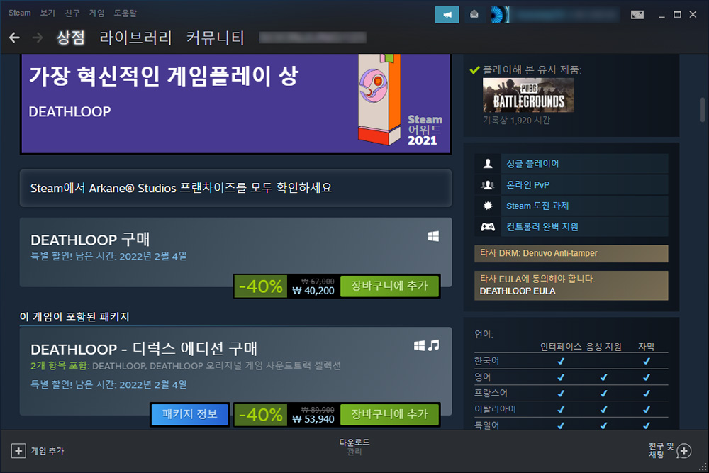 DEATHLOOP(데스루프)는 혁신적인 게임 시스템을 도입했다는 평가를 받고 있습니다. 이름에서도 알 수 있듯이 일종의 루프물이고 독특한 게임 플레이가 가능합니다. 신선한 종류의 게임을 찾는 분들에게 적합합니다. 참고로 가격은 40% 세일을 해서 40,200원입니다.
