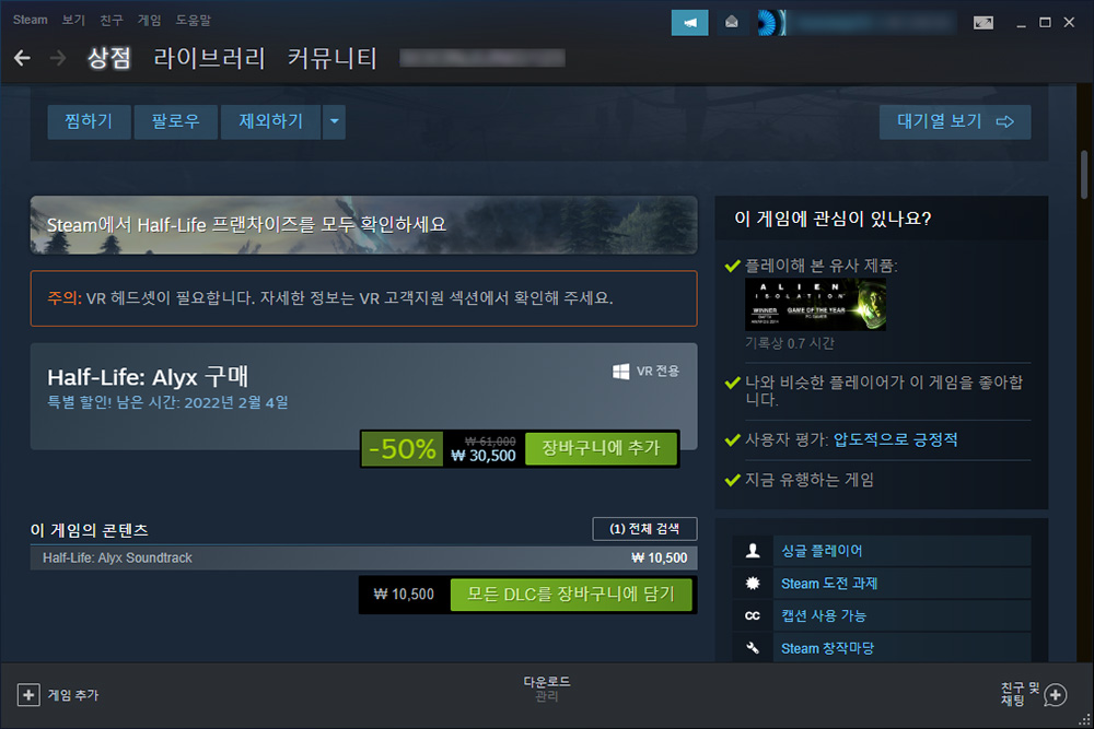Half-Life: Alyx(하프라이프: 알릭스)는 스팀에서 제작한 최신 VR게임입니다. 오큘러스 리프트와 같은 제품을 이용해서 플레이를 할 수 있는데요. VR 장르에서는 최고 수준의 완성도를 가지고 있다는 평가를 받고 있습니다. 참고로 가격은 50% 세일을 해서 30,500원입니다.