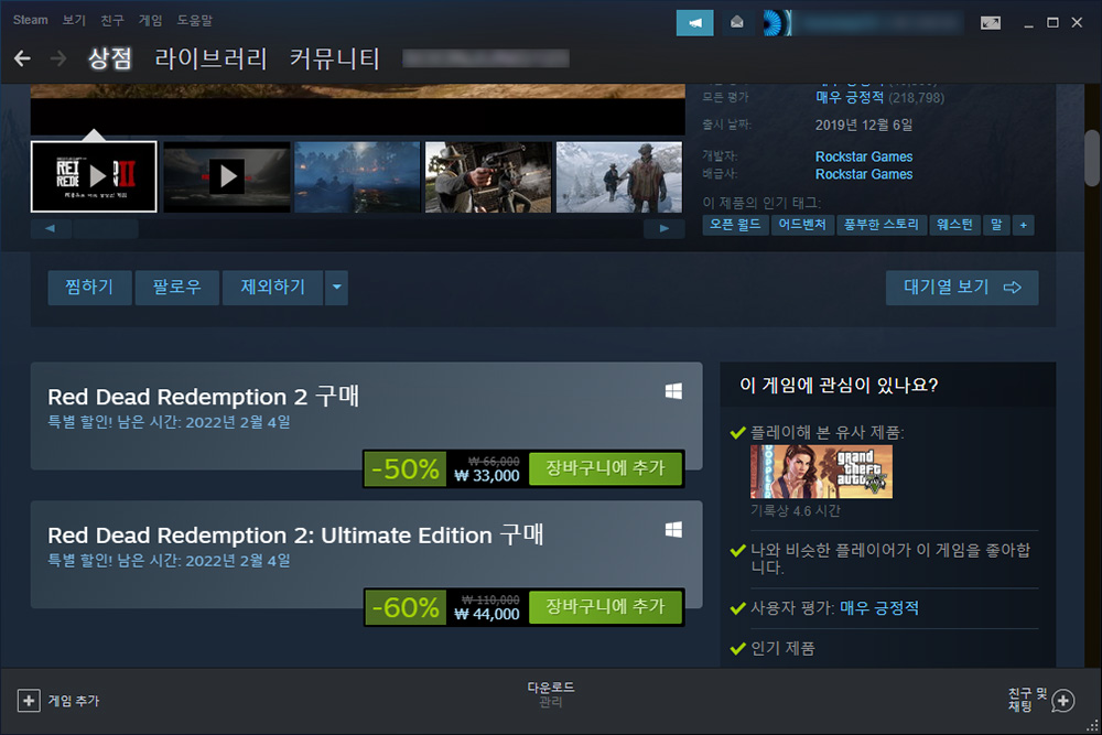 Red Dead Redemption 2(레드 데드 리뎀션 2)는 GTA의 제작사인 락스타 스튜디오에서 2019년 발표한 오픈 월드 액션 어드벤처 게임입니다. 최고 수준의 게임성을 가지고 있다는 평가를 받고 있고 반드시 소장해야 하는 작품입니다. 가격은 50% 세일을 해서 33,000원입니다.