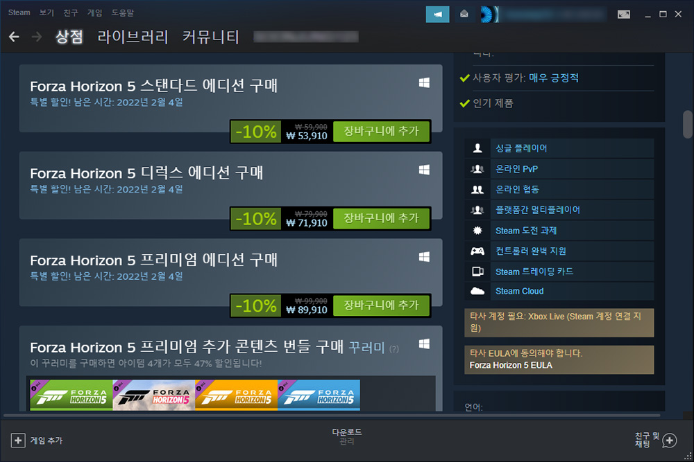 다음 게임은 Forza Horizon 5(포르자 호라이즌5) 최고 수준의 그래픽을 제공하는 레이싱 게임으로 국내에서 많은 팬을 거느리고 있습니다. 최신 게임이라서 할인 폭이 크지는 않고 10% 세일을 해서 53,910원에 구매할 수 있습니다.