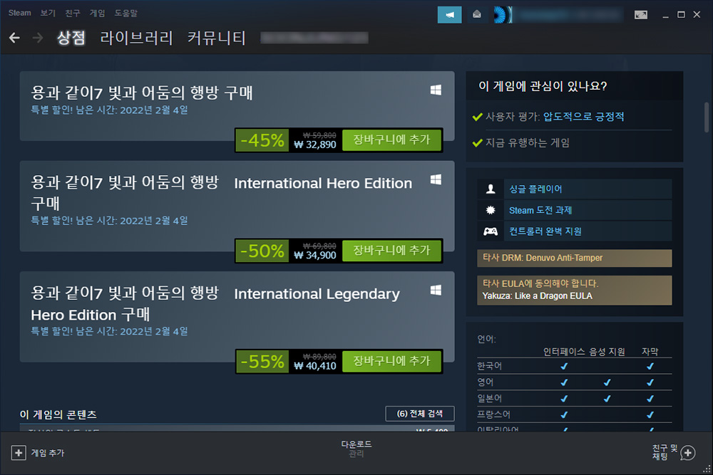 용과 같이 7: 빛과 어둠의 행방은 일종의 RPG 게임으로 시리즈가 오래되어서 많은 팬들이 기대하고 있는 작품입니다. 참고로 가격은 45% 세일을 해서 32,800원으로 책정되었습니다.