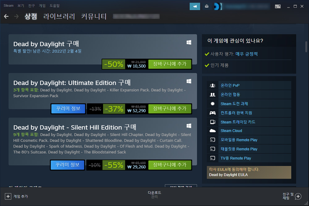 DEAD BY DAYLIGHT(데드 바이 데이라이트)는 비대칭 서바일벌이라는 독특한 공포 게임입니다. 일종의 숨바꼭질이고 심리전을 통해서 전략적으로 플레이할 수 있습니다. 각겨은 50% 세일을 해서 10,500원입니다.