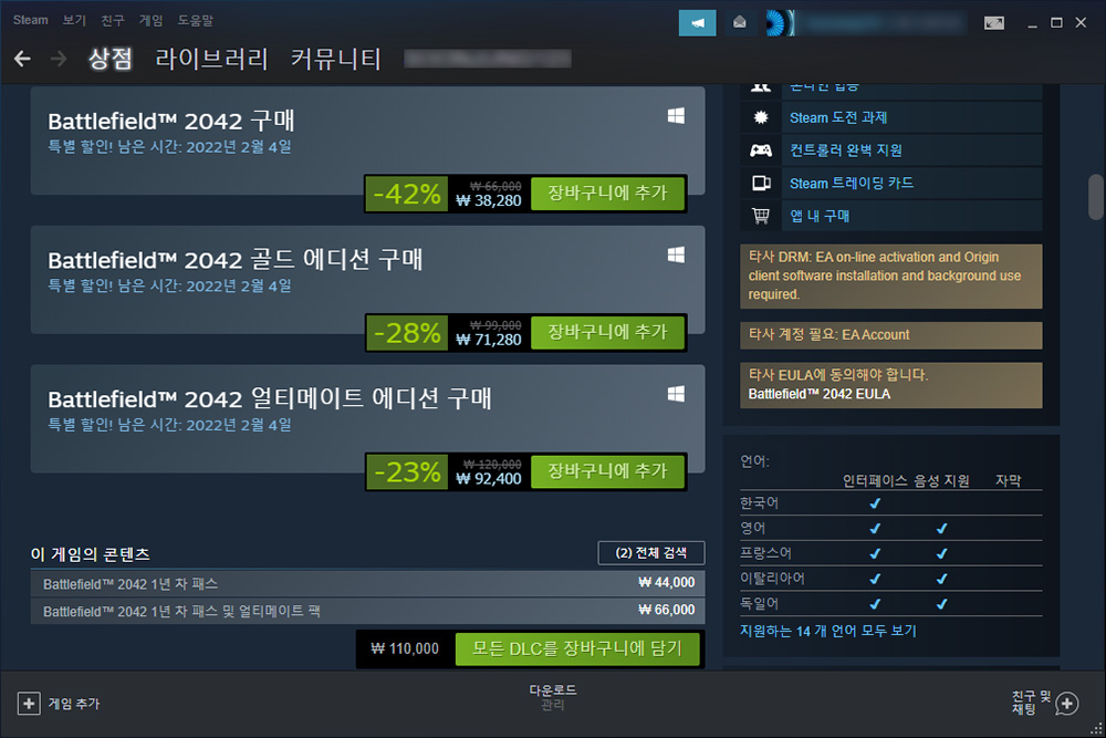 마지막으로 살펴볼 게임은 BATTLEFIELD 2042(배틀필드 2042)입니다. 2021년 11월 14일에 출시된 따끈한 게임으로 FPS 액션 게임을 좋아하는 분들에게 적합합니다. 그렇지만 평가는 그렇게 좋은 편은 아닙니다. 가격은 42% 세일을 해서 38,280원입니다.