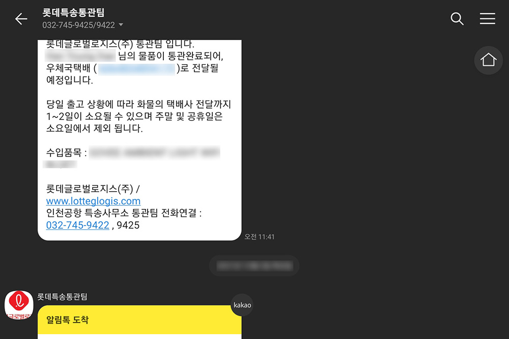 그리고 항공기가 도착하면 롯데특송통관팀에서 통관이 완료되었다는 카카오톡이 옵니다. 그러면 우체국으로 택배가 전달되었다는 것을 의미하고 역시 1~2일 사이에 택배가 도착을 하게 됩니다.