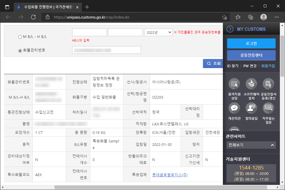 그러면 우리는 우체국 송장번호를 알았습니다. 이 번호를 이용해서 관세청 유니패스에 접속을 한 후에 M B/L – H B/L 항목에 운송장 번호를 입력해 주면 현재 통관 정보화 빗행기 항공편명을 확인할 수 있습니다. 만약 조회되지 않는다면 1~2일 정도 기다려 보시길 바랍니다.