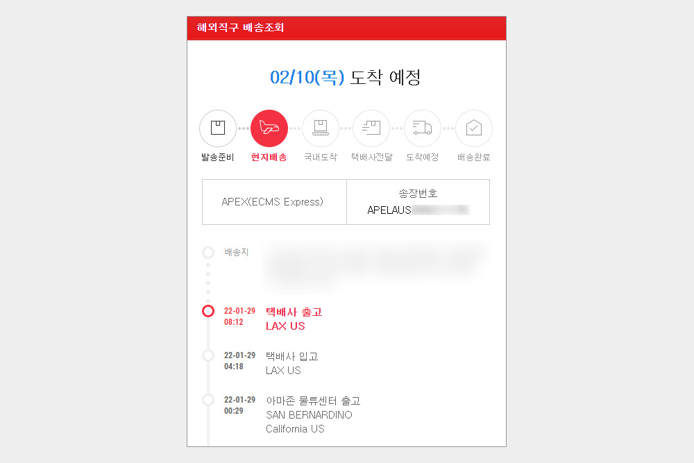 우선 11번가 홈페이지에서 APEX(ECMS Express) 송장번호를 먼저 확인해야 합니다. 보통 APELAUS숫자로 이루어져 있고 아마존 물류센터 입고 SAN BERNARDINO California US나 택배사 출고 LAX US와 같은 메시지를 확인할 수 있습니다. 이 때 스마트폰에 롯데택배 앱을 설치하면 우체국 송장번호를 확인할 수 있습니다. 롯데택배 앱을 설치해야 하는 이유는 아마존 통관의 일부를 롯데특송통관팀이 관리하기 때문입니다.