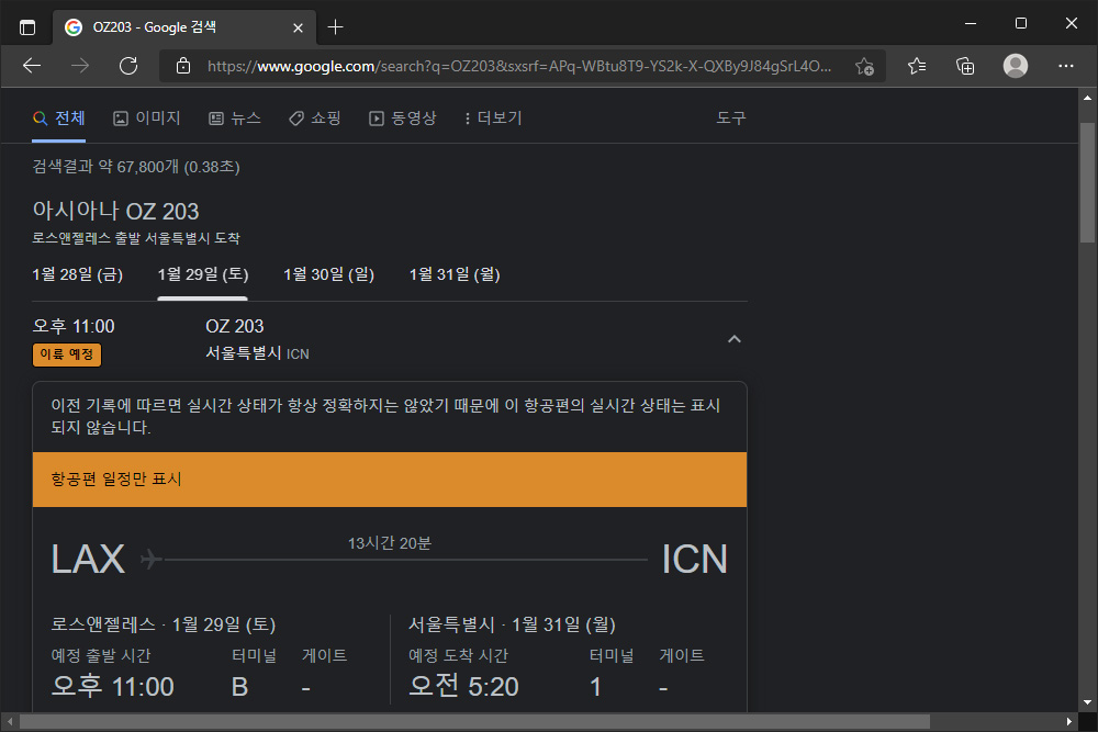 그리고 언제 자신의 택배가 비행기를 타는지 궁금하신 분들은 유니패스의 항공기 정보를 구글에 넣으면 LAX TO ICN 비행기 정보를 확인할 수 있습니다. 이 정도까지 검색을 했으면 제대로 화물이 도착하고 있다는 것을 확인할 수 있습니다.