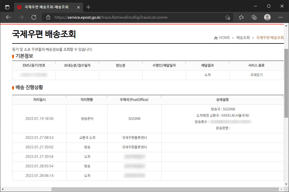 실제로 우체국의 EMS 메뉴를 통해서 검색해 보면 1월 27일에 국제우편물류센터 교환국에 도착한 것을 확인할 수 있습니다. 어떤 이유인지는 확인할 수 없지만 17트랙과 CAINIAO의 정보가 정확하지 않은 것을 확인할 수 있습니다.