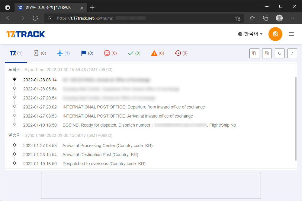 제가 제품을 구매한 날짜는 2022년 1월 10일이고 17트랙 기준으로 19일에 despatched to overseas라는 메시지가 전송되었고 23일에 arrival at destination post라는 정보가 검색되었습니다. 그래서 저는 한국에 들어왔다고 하는 생각을 했지만, 아니었습니다.