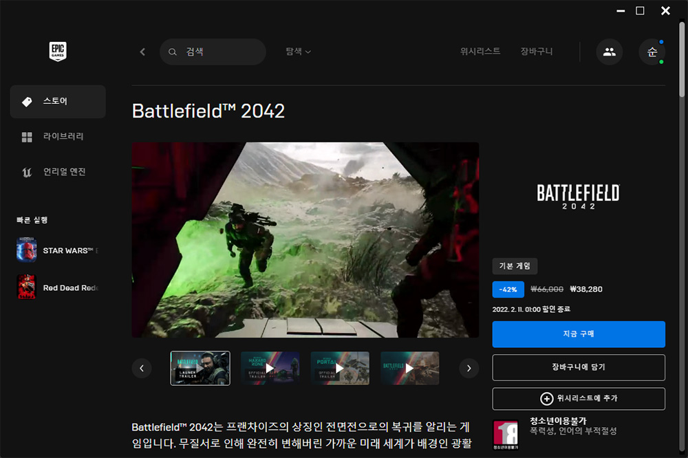 BATTLEFIELD 2042(배틀필드 2042)는 배틀필드 시리즈의 최신 작품입니다. 출시 전에는 전투기에서 탈출하면서 RPG를 쏘는 티저 영상으로 큰 관심을 받았지만 게임 자체에 대한 평가는 미묘합니다. 가격은 42% 할인을 해서 38,280원입니다.
