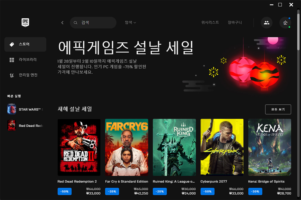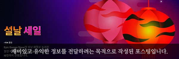 우리에게 포트나이트나 언리얼 게임 엔진으로 잘 알려진 에픽게임즈는 매주 무료 게임을 배포하며 많은 게이머의 사랑을 받고 있습니다. 그리고 이번에 설날을 맞아서 11,000원짜리 에픽 상품권을 제공하는 것은 물론이고 다양한 종류의 게임 할인을 시작했습니다. 그래서 이번 포스팅에서 설날 세일 게임의 종류와 가격을 자세하게 확인해 보도록 하겠습니다