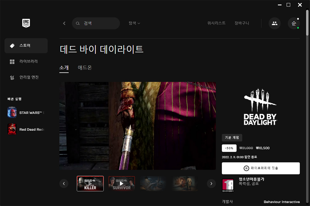 Dead by Daylight(데드 바이 데이라이트)는 스트리머 사이에서도 인기가 많은 서바이벌 게임입니다. 가격은 50% 할인을 해서 10,500원입니다. 저렴한 편이서 친구들과 함께 플레이하는 것을 추천합니다.