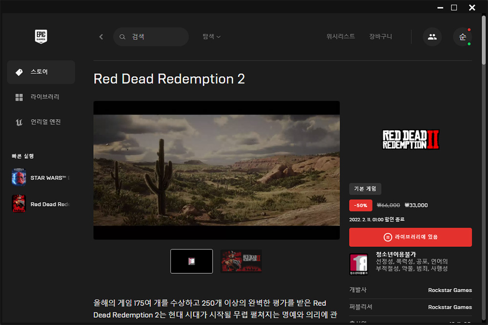 가장 먼저 살펴볼 게임은 Red Dead Redemption 2(레드 데드 리뎀션 2)입니다. GTA 시리즈의 제작사로 유명한 락스타 게임즈의 우주 명작이라는 평가를 받는 제품입니다. 참고로 가격은 50% 세일을 해서 33,000원입니다.