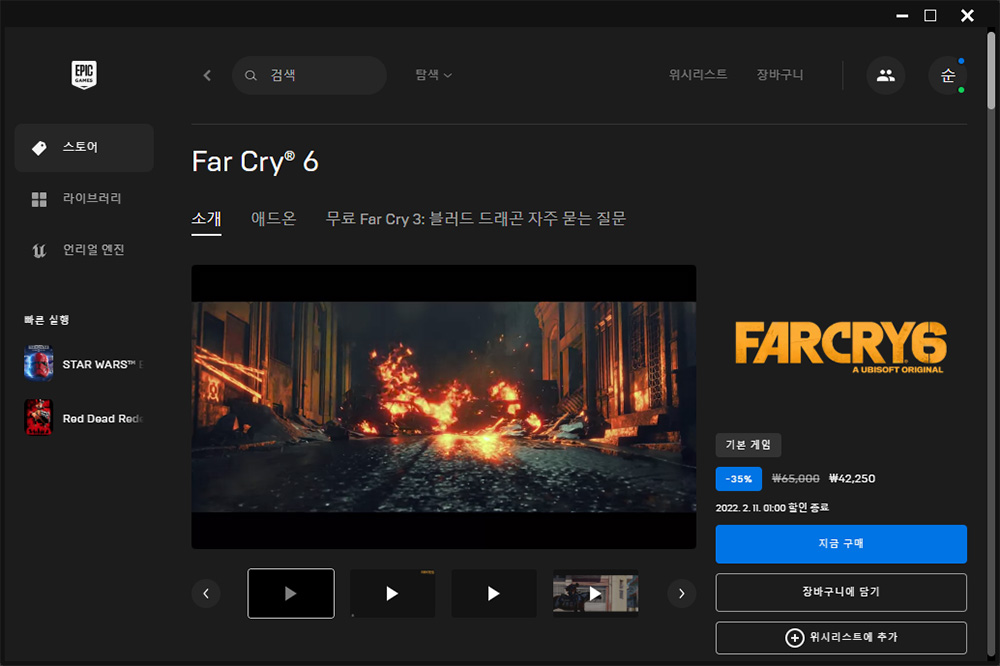 에픽게임즈 설날 세일은 다양한 게임들로 구성되어 있습니다. Red Dead Redemption 2(레드 데드 리뎀션 2)나 FAR CRY 6(파 크라이 6) 등 명작이라는 평가받는 제품들로 구성되어 있습니다.