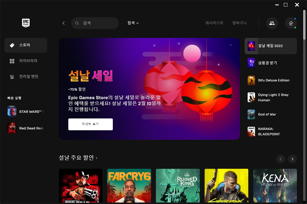 우리에게 포트나이트나 언리얼 게임 엔진으로 잘 알려진 에픽게임즈는 매주 무료 게임을 배포하며 많은 게이머의 사랑을 받고 있습니다. 그리고 이번에 설날을 맞아서 11,000원짜리 에픽 상품권을 제공하는 것은 물론이고 다양한 종류의 게임 할인을 시작했습니다. 그래서 이번 포스팅에서 설날 세일 게임의 종류와 가격을 자세하게 확인해 보도록 하겠습니다