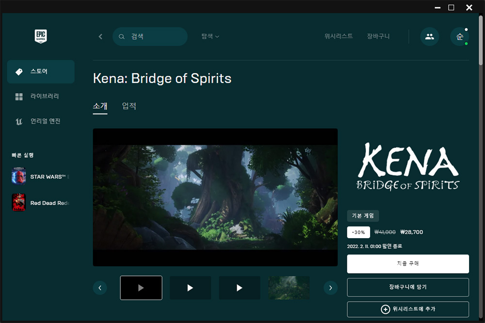 Kena: Bridge of Spirits(케나: 브릿지 오브 스피릿)는 오픈 월드 액션 어드벤처입니다. 애니메이션 제작사에서 제작한 작품이라서 귀여운 캐릭터와 컷신의 퀄리티가 높다는 특징이 있습니다. 가격은 30% 할인을 해서 28,700원입니다.