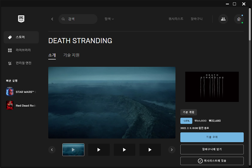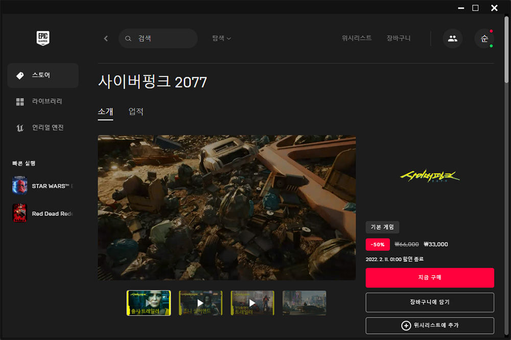 가장 먼저 에픽게임즈에 가입을 하고 런처를 다운로드 받아야 합니다. 그리고 스토어의 홈 화면에서는 다양한 종류의 게임들이 할인을 시작하고 있는 것을 확인할 수 있습니다. 참고로 기간은 2022년 2월 10일까지입니다.